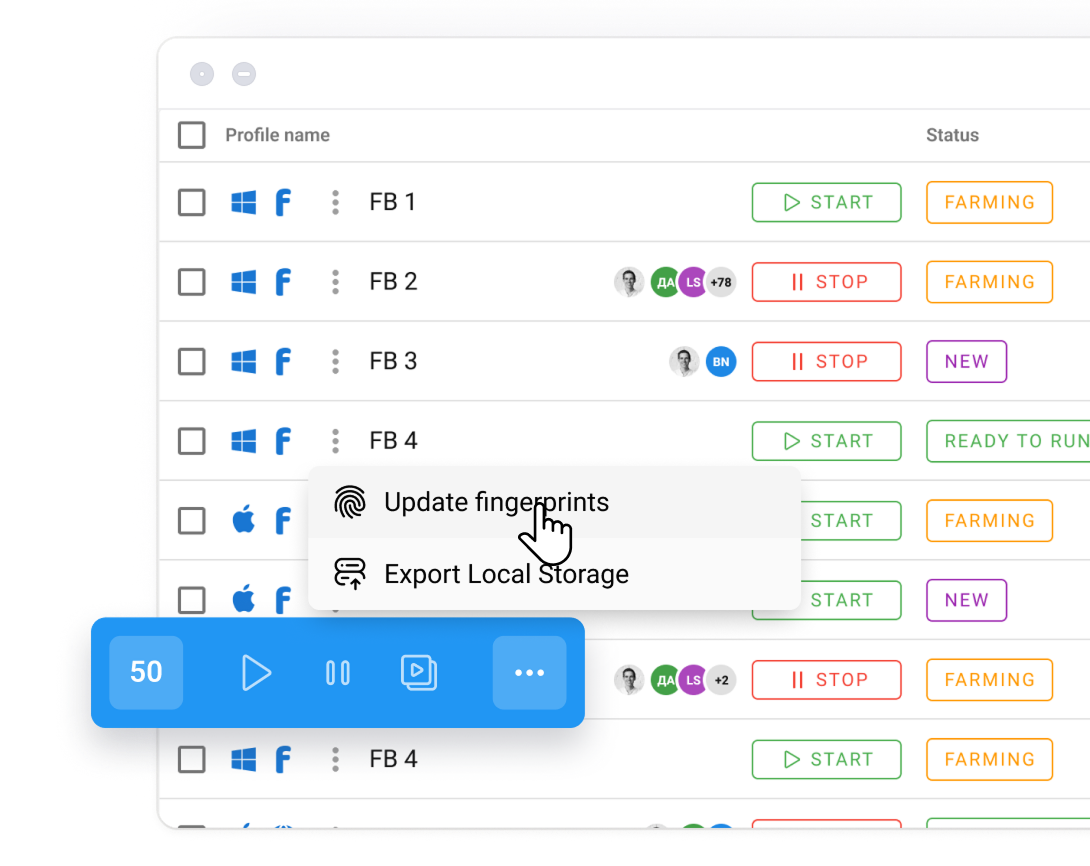 Group by niches, status and any other criteria. Use the layout, icons and color indication to quickly find browser profiles.